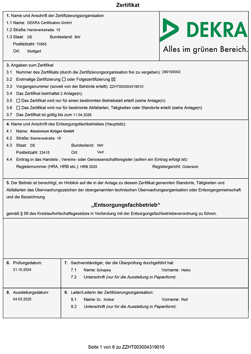 Wir sind DEKRA-zertifiziert und offiziell als Entsorgungsfachbetrieb anerkannt.